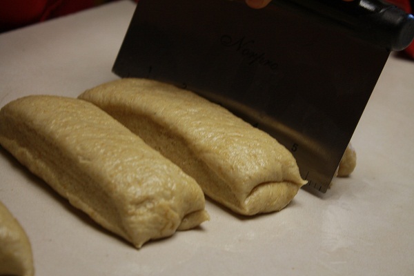 Cut in strips.   The Norpro cutter scraper is the best tool to do multiple jobs.  In this case, cutting my bread dough.